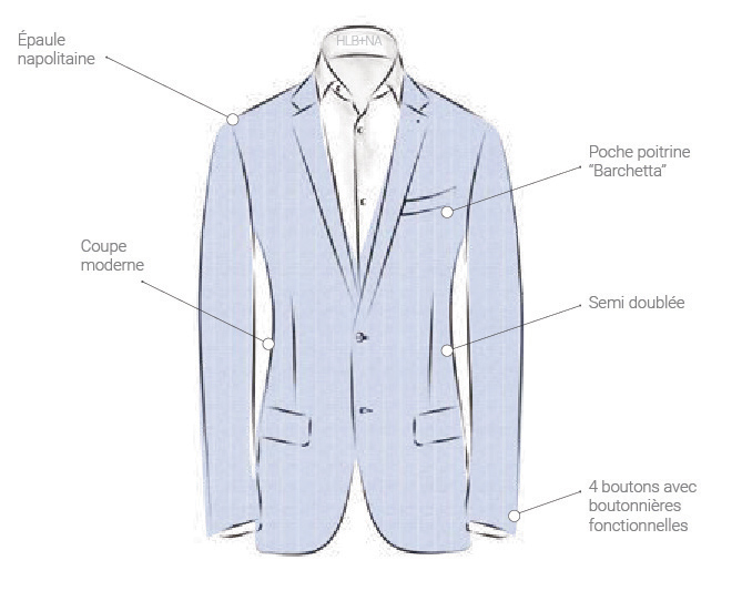 La veste Napolitaine vous procurera confort et liberté de mouvements de par son emmanchure haute et sa demi-doublure.